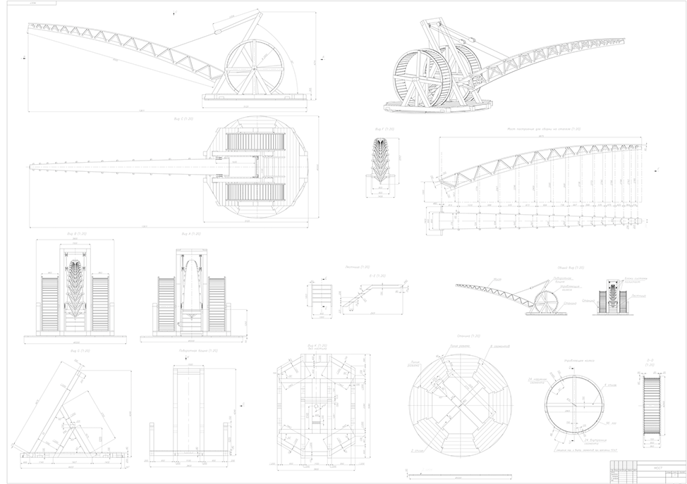 The author calls into question the physical impossibility to connect apparently distant or nonexistent objects, such as the horizon. The bridge is driven by two wheels. A person can enter it and move inside and to hold handrails, as on a treadmill, change the angle of the bridge vertically and horizontally. Also, the wheels can be operated standing outside from a special platform at the beginning of the bridge.