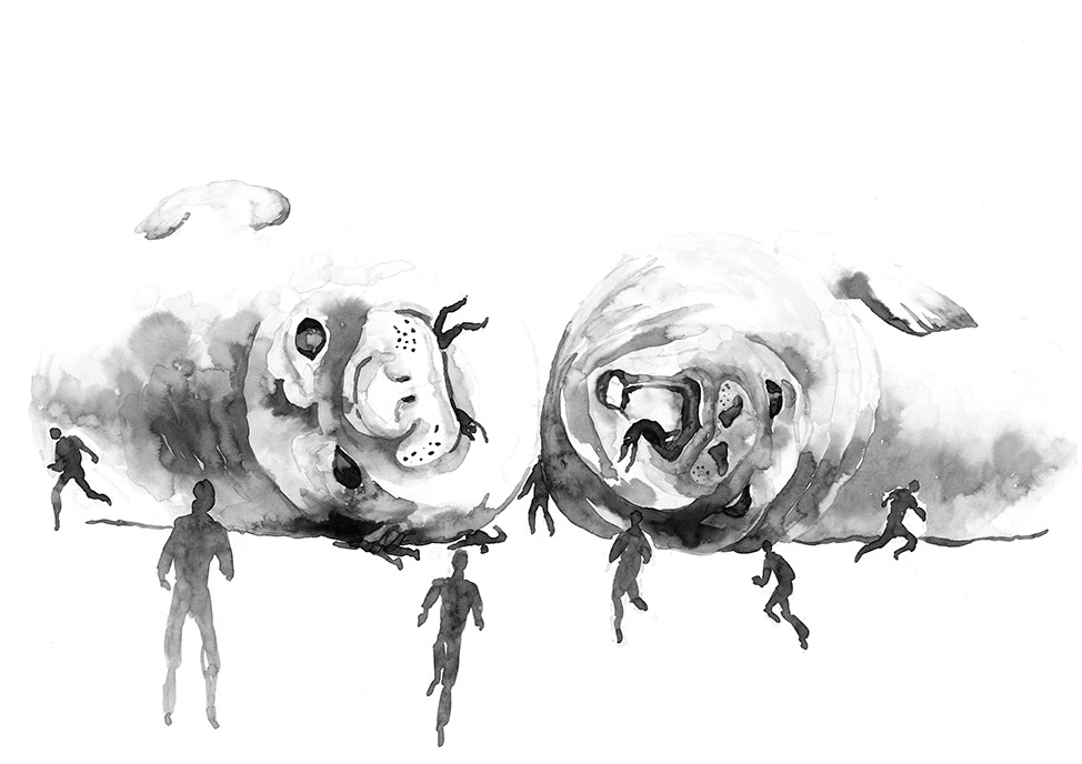 In Shalenny’s VR work the viewer goes beyond the horizon on a compressed forty thousand kilometers journey around the world. A game of chance, the journey is the outcome of a line drawn from a bridge and further across the world, taking place in the dead of night, where fuzzy silhouettes of people tear along through desolated landscapes, fleeing into gray blizzards and shadowy forests. Based on watercolors by the artist, one setting replaces the other as the ghost like figures cross birch forests, oil fields, abandoned churches and oceans in the seemingly limitless universe.